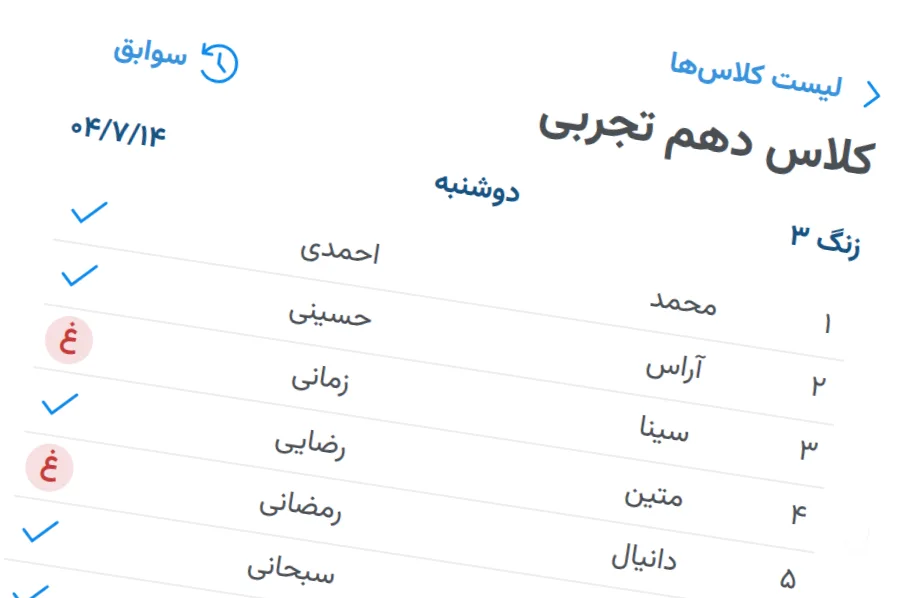 - حضور و غیاب در کلاس و مستقیما توسط معلم انجام میشود.